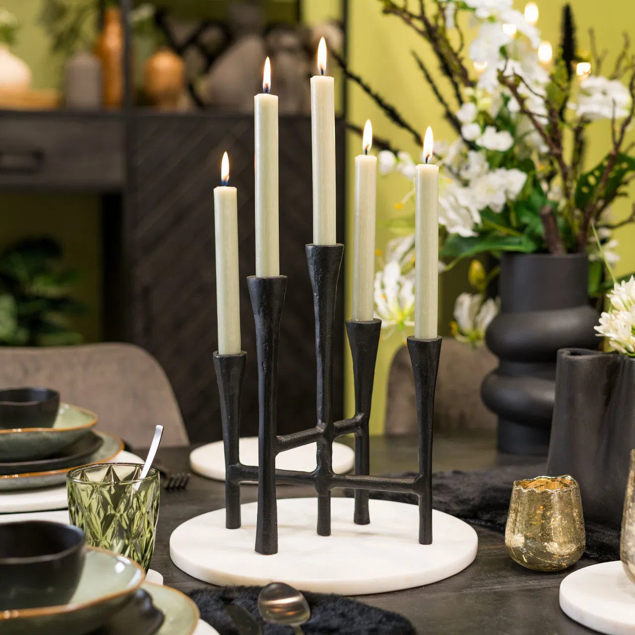 Deux grandes bougies élancées avec une finition lisse et des sommets en forme de flamme. Plusieurs couleurs disponibles.