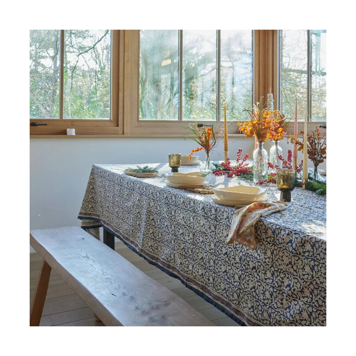 Nappe à imprimé floral bohème indien. Nous avons décidé d'élargir nos magnifiques gammes d'imprimés indiens en créant une collection originale « block print ». Ces nappes ont été conçues par notre équipe de designers puis imprimées à la main par des artisans de Jaipur selon la technique du tampon en bois sculpté à la main... Une tradition qui nous a toujours séduits lors de nos nombreux voyages en Inde. Nos palettes de couleurs revisitées égayeront vos moments estivaux en famille ou entre amis... L'originalité a été poussée à l'extrême avec le travail des bordures fleuries qui entourent toutes les nappes. Nos imprimés sont exclusifs. Finition de l'ourlet. Tissu : popeline imprimée en pur coton doux